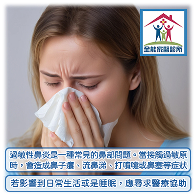 過敏性鼻炎若影響到您的日常生活,建議尋求醫療幫助。全能家醫診所擁有專業醫師團隊,也設有抽血檢驗過敏原項目,能夠全面檢查和評估您的症狀,提供最適合的治療方案,致力於緩解症狀與改善生活品質,幫助鼻子恢復舒適暢通!有相關問題歡迎到全能家醫診所就醫諮詢,謝謝!