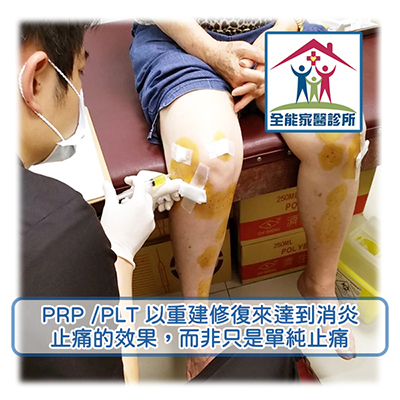 PRP/PLT(增生療法)是抽取患者自身血液,經離心分離血液成份,取得富含血小板的血漿,再注射到受傷部位,因血小板內含的生長因子具有組織修復的功能,且血液是取自患者本身,不易產生排斥反應。