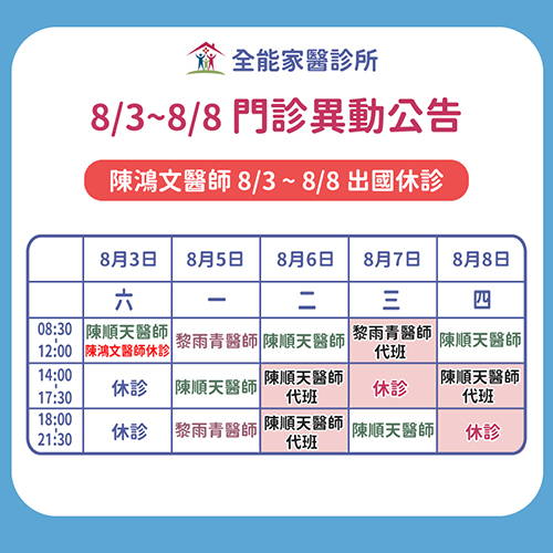 113/08/03(六)至113/08/08(四),門診暫由其他醫師代診