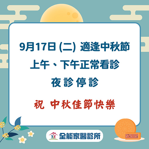 9/17(二) 上午診08:30~12:00 下午診14:00~17:30